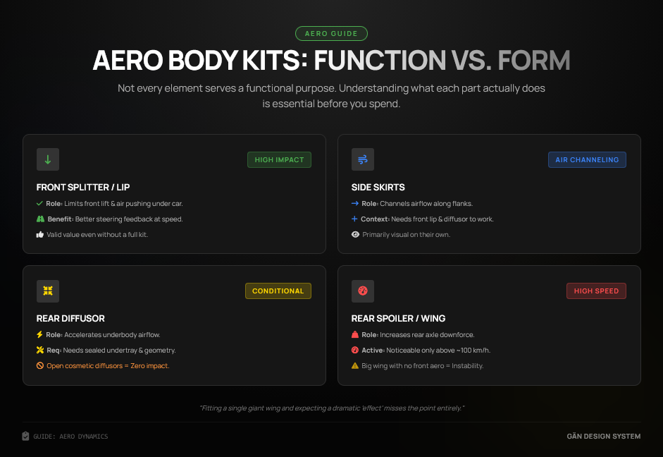 Not every element of an aero body kit serves a functional purpose. Understanding what each part actually does is essential before you spend.