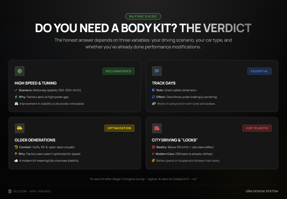 To put it plainly: a good aerodynamic body kit is an engineering tool with certified documentation — not a wide plastic catalogue item.