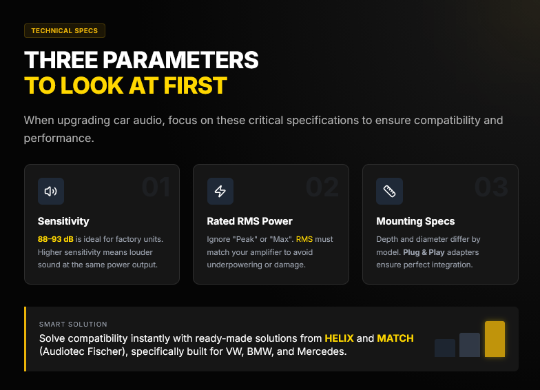 - Mounting depth and diameter: compatibility with your specific car model is not optional. This is solved with ready-made Plug & Play adapters — specifically, the HELIX and MATCH lineups from Audiotec Fischer, built for VW Group, BMW, and Mercedes models.