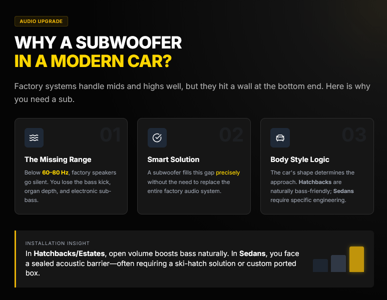 Factory audio systems in modern cars — even in non-base configurations — handle midrange and high frequencies quite well. The problem is almost always the same: below 60–80 Hz, there’s nothing. That’s where the kick of a bass guitar lives, the lower register of an organ, the sub-bass of electronic music.