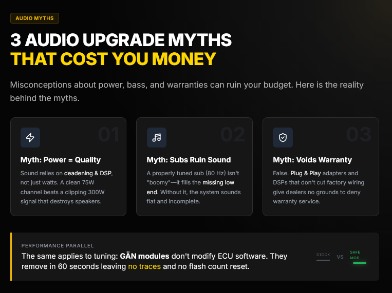 This depends entirely on the installation method. Plug & Play adapters and DSP solutions that don’t touch the factory wiring give the dealer no formal grounds to deny warranty service. The same principle applies to performance tuning: GÄN uses modules that don’t modify the ECU software and remove in 60 seconds — no traces, no flash counter reset.
