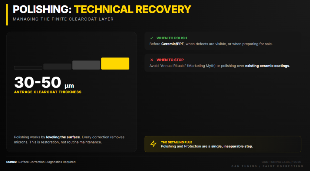 The catch: the clearcoat on most modern vehicles is only 30–50 µm thick. Every polish removes a few microns. That means polishing is not a routine annual ritual — it is a targeted correction carried out before applying a protective product, or when there is a genuine need.