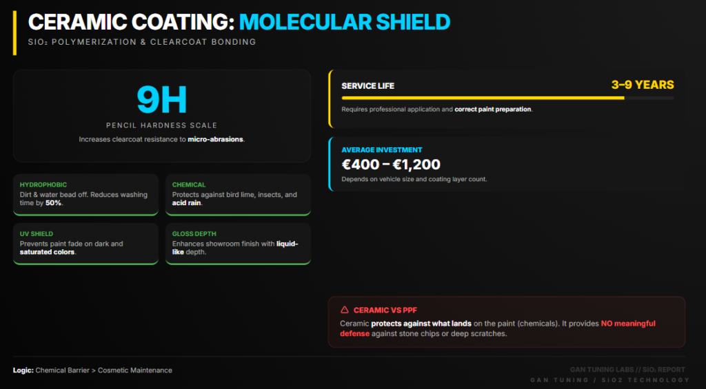 Ceramic coating is a liquid polymer based on silicon dioxide (SiO₂) that bonds chemically with the vehicle’s clearcoat. Once cured, it forms a hard, hydrophobic layer. This is not a wax that washes off after a few weeks — it is a fully bonded car paint protection layer that lasts for years.