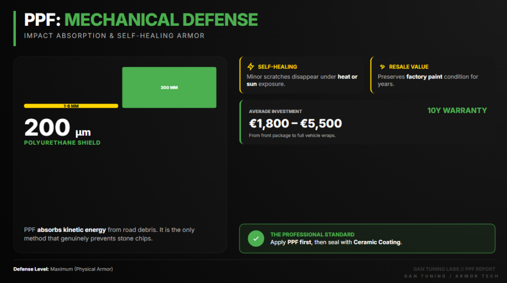 Paint protection film (PPF) is a physical film laid over the paint. It protects against stone chips, scratches, and minor impacts. It is the only method that genuinely absorbs mechanical force.