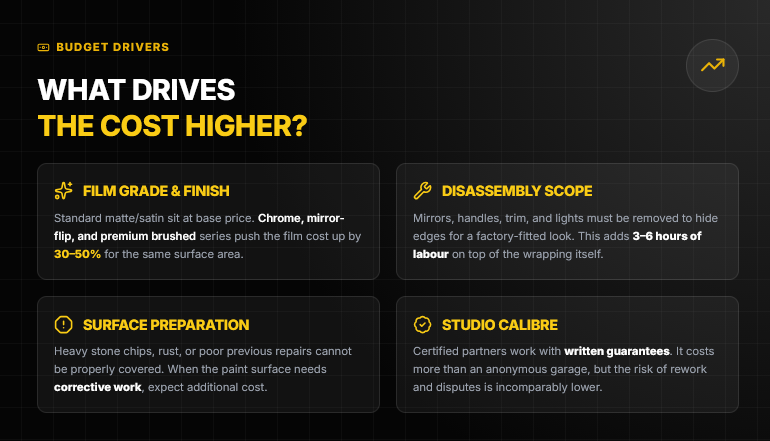 Disassembly scope. A professional result requires removing mirrors, door handles, trim strips, sometimes lights and bumpers — edges are hidden behind panels so the wrap looks factory-fitted rather than applied on top. That adds three to six hours of labour on top of the wrapping itself.