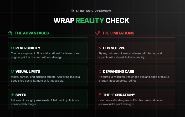 Compared to a full respray: a quality paint job with full disassembly takes roughly the same or more than a full car vinyl wrap, takes longer, and is irreversible. At resale, factory paint commands a higher value. The wrap wins precisely because it can be undone.