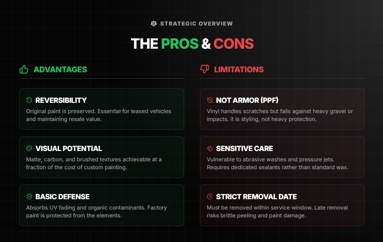 Real-world experience from wrap owners paints a clear picture. Choose the right material and a competent studio, and you’ll almost certainly be satisfied. Cut corners on either — and you’ll regret it. Here are the genuine car wrap pros and cons, without the marketing gloss.
