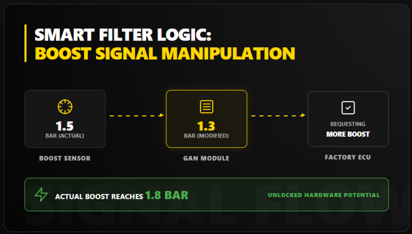 Your boost pressure sensor reads 1.5 bar. The module intercepts this signal and changes it to 1.3 bar before sending it to the ECU. The ECU thinks boost is low, so it requests more boost pressure to compensate. Actual boost climbs to 1.8 bar, producing more power.