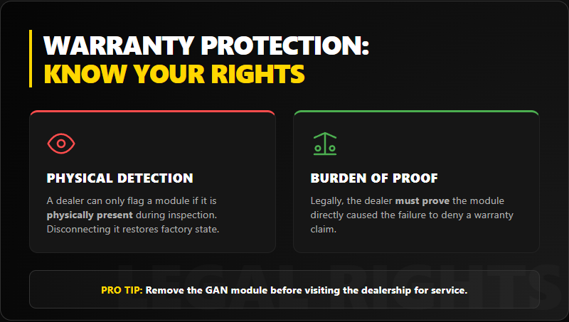 Reality from GAN’s experience across 8 countries: most warranty claims with external modules get honored because dealers can’t prove causation for unrelated failures, and most owners remember to remove modules before service.