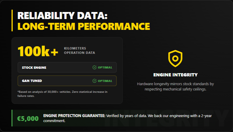 Engines with external modules show no statistically significant difference in failure rates compared to stock engines over 100,000+ km of operation. The €5,000 guarantee backs this up – if failures were common, they couldn’t afford to offer it.