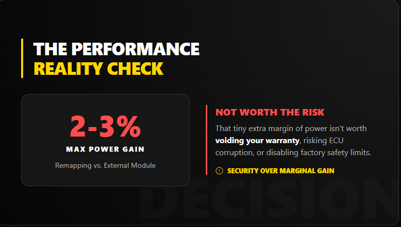 Based on GAN’s testing on over 30,000 vehicles since 2015, the performance difference between good external modules and good ECU remapping is typically 2-3% at most. That’s within measurement error on most dynos.