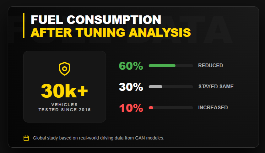 GAN’s data from testing over 30,000 vehicles since 2015 shows the split pretty clearly: about 60% of drivers see reduced fuel consumption, 30% see roughly the same consumption, and 10% see increased consumption. The difference? Driving behavior.