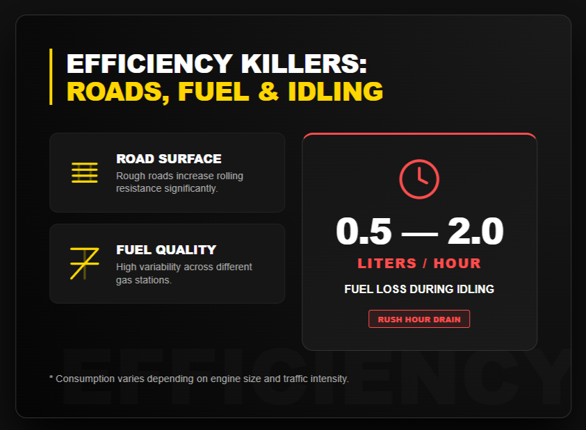 Stop-and-go traffic means constant acceleration and braking – the most fuel-intensive type of driving. Quality of road surface matters (rough roads = more rolling resistance). Fuel quality varies wildly between gas stations. And idling in traffic burns 0.5 to 2 liters per hour depending on engine size, which adds up fast during rush hour.