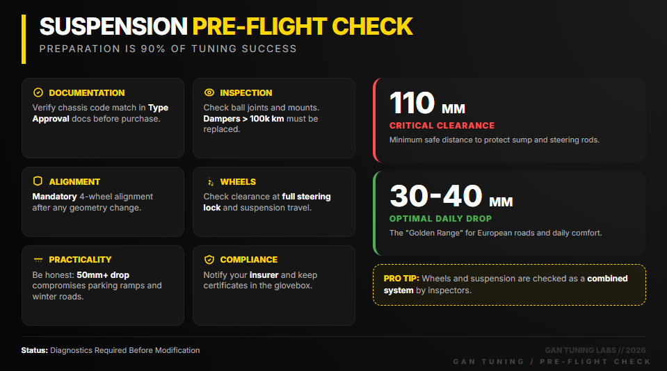 Most problems with suspension tuning don’t come from the components themselves — they come from poor preparation and incompatible combinations. Fitting multiple systems at once (suspension plus wheels plus brakes) also creates additional complexity, since inspection bodies typically assess each combination separately.
