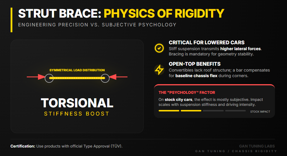On a standard, unmodified car with factory suspension used in urban traffic and relaxed motorway driving — the difference will most likely remain subjective. The automotive engineering community is honest about this: the effect of a strut bar scales with suspension stiffness and the intensity of use. On a stock car it’s questionable. On a lowered, stiffened and tuned car it becomes a different conversation.