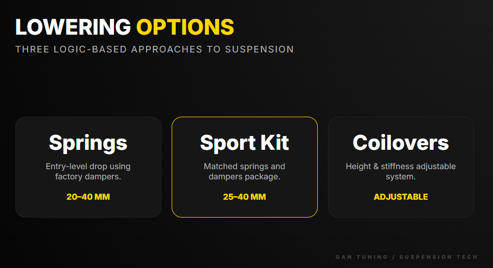 | Parameter | Lowering Springs | Sport Kit | Coilovers |