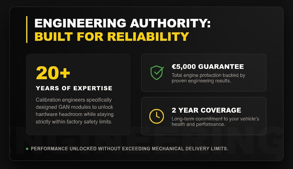 Engineers with over 20 years of calibration experience designed GAN modules specifically to work within factory safety limits while unlocking the performance headroom in the hardware. That’s why they can offer a €5,000 engine guarantee for 2 years – the modules don’t ask for anything the engine can’t safely deliver.