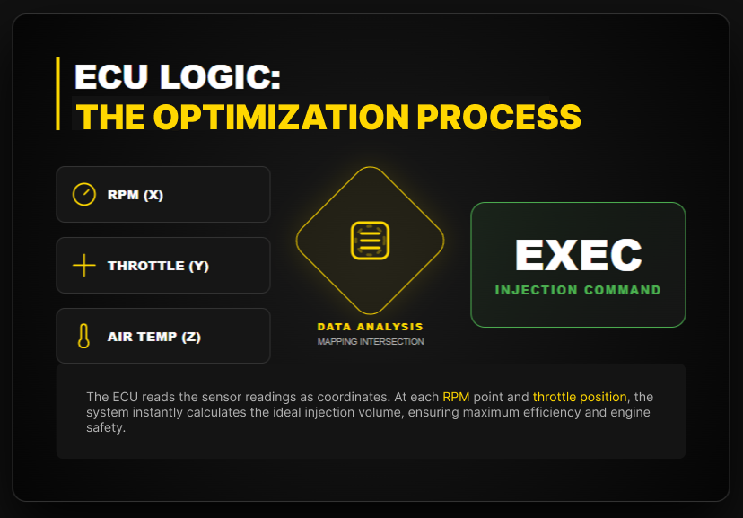 The ECU takes all those inputs, looks them up in its fuel maps – which are basically massive tables saying «at X RPM and Y throttle position with Z air temperature, inject this much fuel» – and outputs commands to make it happen.