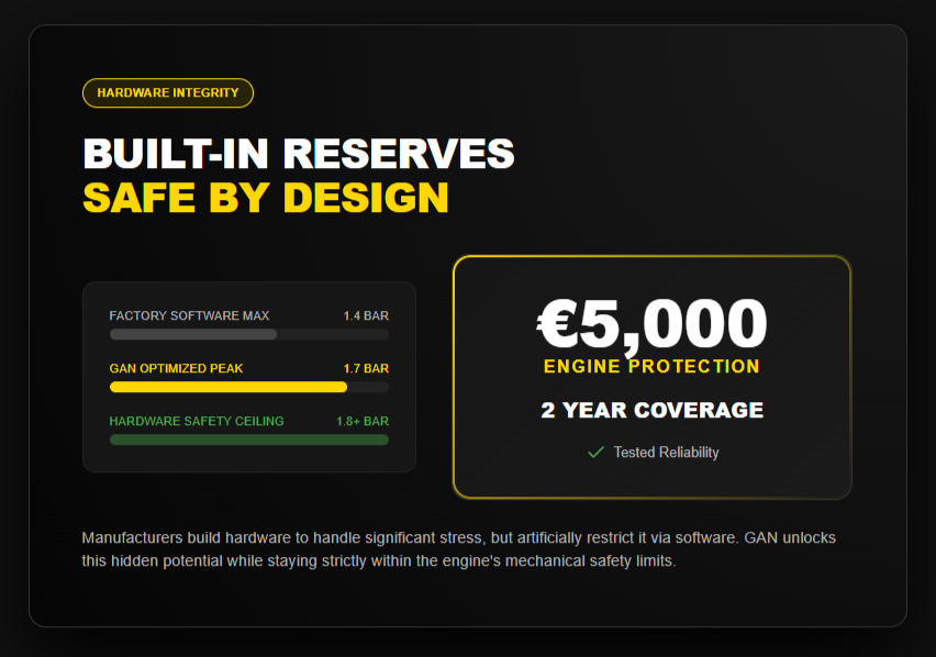 - Answer: Not if done properly. GAN modules stay within the engine’s actual mechanical limits (not the arbitrary software limits). That’s why they can offer a €5,000 engine guarantee for 2 years. The hardware was built to handle more power – manufacturers just chose not to use it.